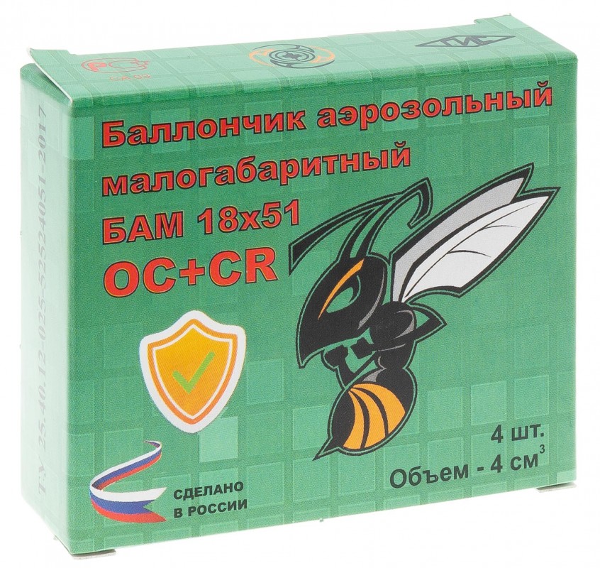 Данный вид боеприпасов для аэрозольных пистолетов прошел все необходимые процедуры сертификации, что позволяет владельцам АП «Добрыня» и «Пионер» свободно купить БАМы ОС+CR 18х51 «Шершень» в любом магазине России, и в случае необходимости применить их для нужд самообороны. При попадании на лицо комбинированного действующего вещества OC+CR преступник испытывает острый болевой шок и на 15-25 минут теряет ориентацию в пространстве из-за мгновенного рефлекторного смыкания век (блефароспазма), интенсивного выделения слез и непрекращающегося приступа удушающего кашля.