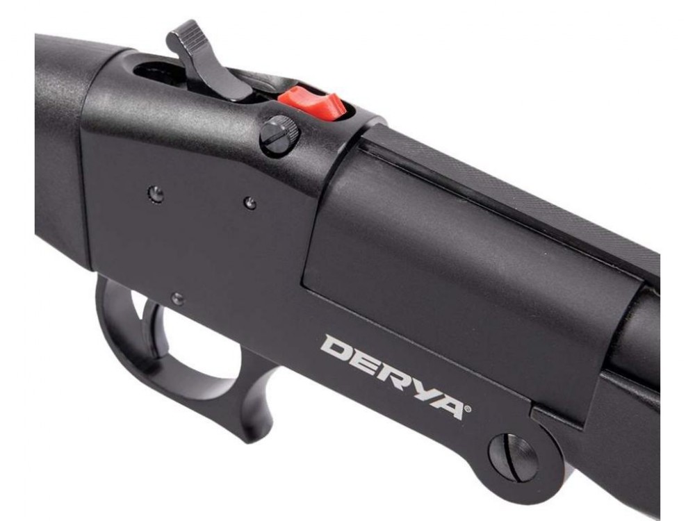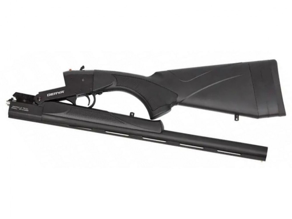 Прицельные приспособления - вентилируемая планка и латунная мушка. Приклад и цевье ружья Дериа Сингл СС-103 выполнены из черного пластика, в местах хвата имеется ромбовидное рифление. Безопасность обращения с оружием обеспечивает предохранитель.